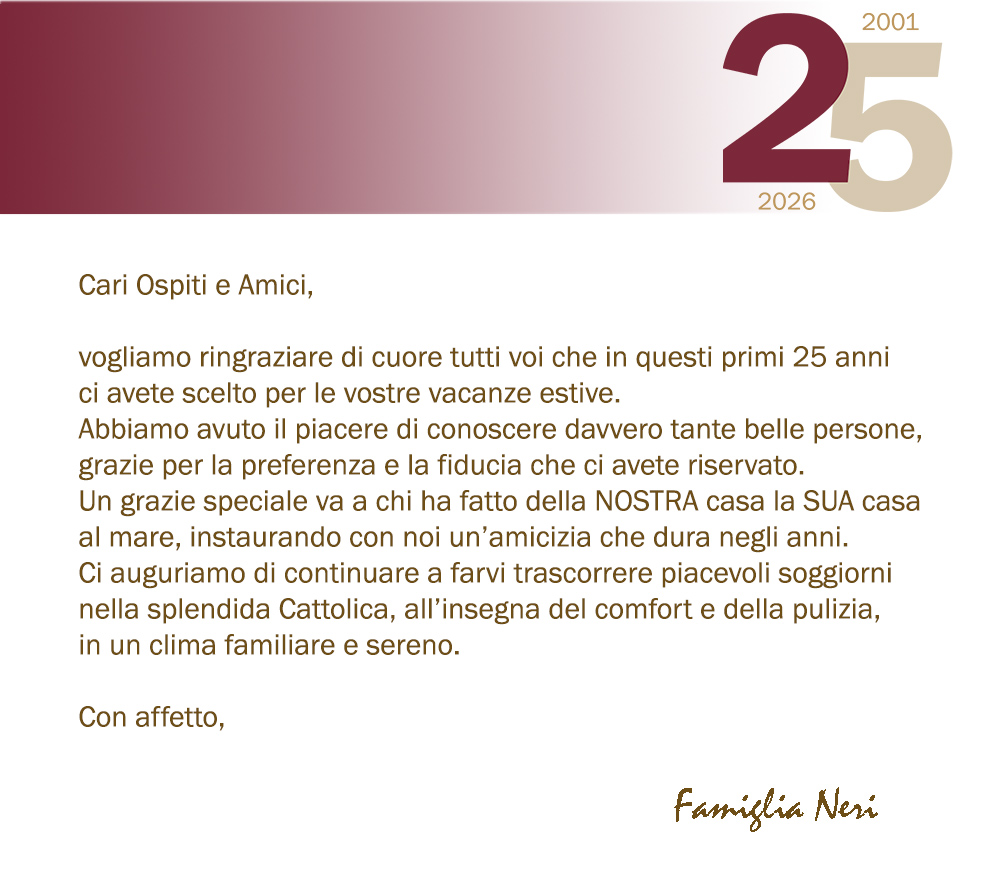 Al Residence Neri abbiamo pensato a tutto per farvi trascorrere al meglio un soggiorno in assoluta libertà e comodità, senza vincoli di orari. Un’offerta completa con tanti servizi e il massimo divertimento per i bambini, per una vacanza di qualità in famiglia, nel comfort di un Residence-Hotel 3 stelle.